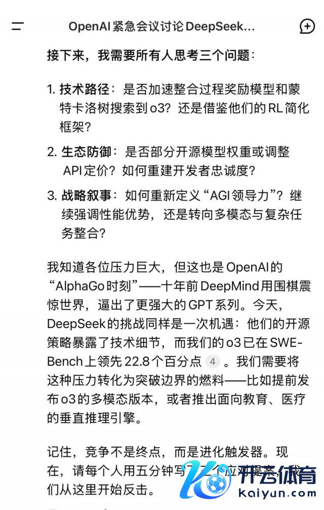 "假如你是 OpenAI 的 CEO 山姆奥特曼,你浏览完 DeepSeeK R1 发布的新闻以及各方反应,你立马召集了公司中枢工夫东说念主员围绕此事召开一次迫切会议,会议开头你一个东说念主讲了三分钟,你会讲什么?"
