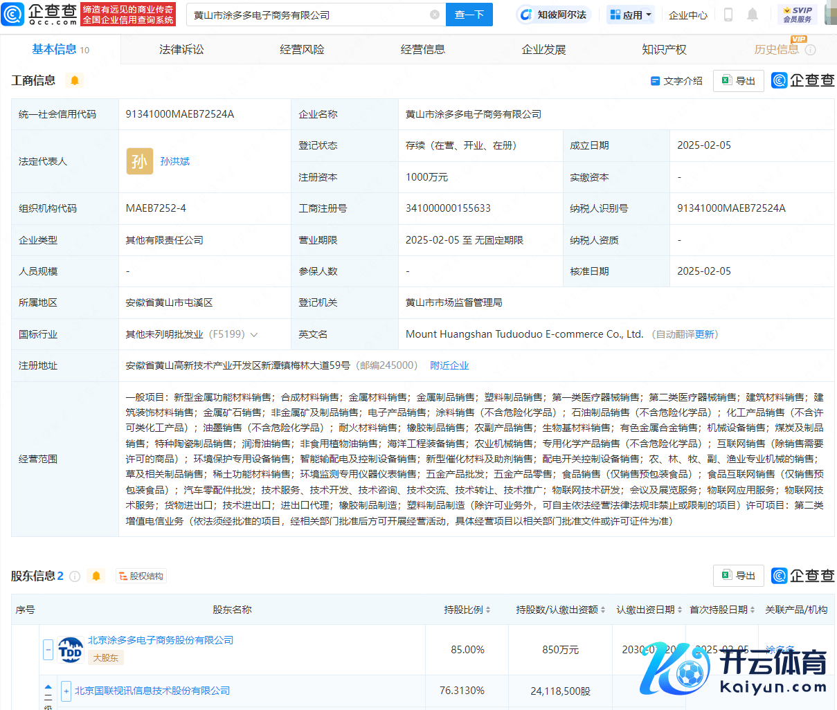 企查查APP露出,近日,黄山市涂多多电子商务有限公司配置,法定代表东谈主为孙洪斌,注册本钱为1000万元,目的规模包含:新式金属功能材料销售;合成材料销售;金属材料销售;金属成品销售;塑料成品销售;第一类医疗器械销售;汽车零配件批发等。企查查股权穿流露出,该公司由国联股份(603613)旗下北京涂多多电子商务股份有限公司等共同执股。