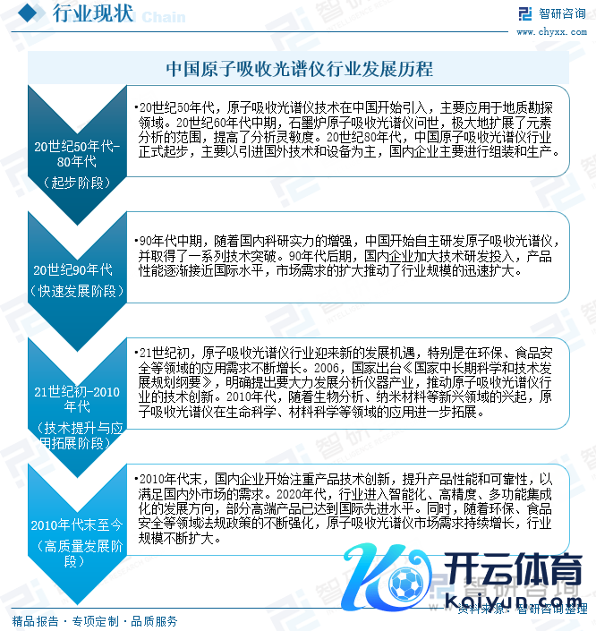 中国原子领受光谱仪行业发展主要资历了四个阶段。20世纪50年代至80年代的起步阶段,20世纪50年代,原子领受光谱仪本领在中国运转引入,主要应用于地质勘测界限。20世纪60年代中期,石墨炉原子领受光谱仪问世,极地面膨胀了元素分析的范围,提高了分析灵巧度。20世纪80年代,中国原子领受光谱仪行业认真起步,主要以引进外洋本领和拓荒为主,国内企业主要进行拼装和坐蓐。