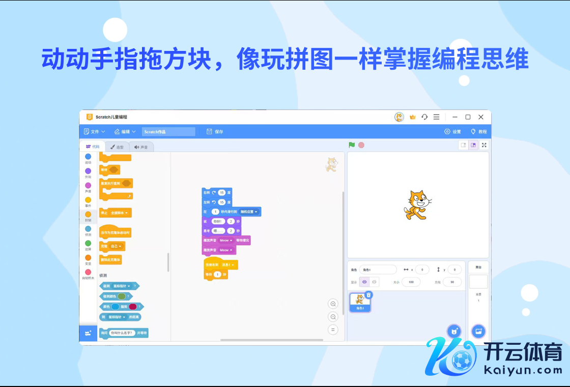 软件内置了丰富的教学资源,优秀实例以及每个积木块对应的指示主见开云kaiyun,极大的镌汰了学习的门槛,Scratch儿童编程软件是一款弘大而易用的编程学惯用具,非论是对孩子已经成东说念主来说,齐是一个联想的编程初学平台。
